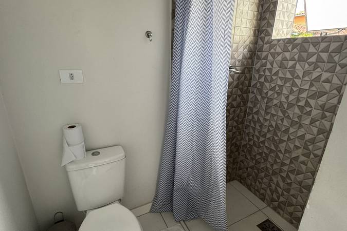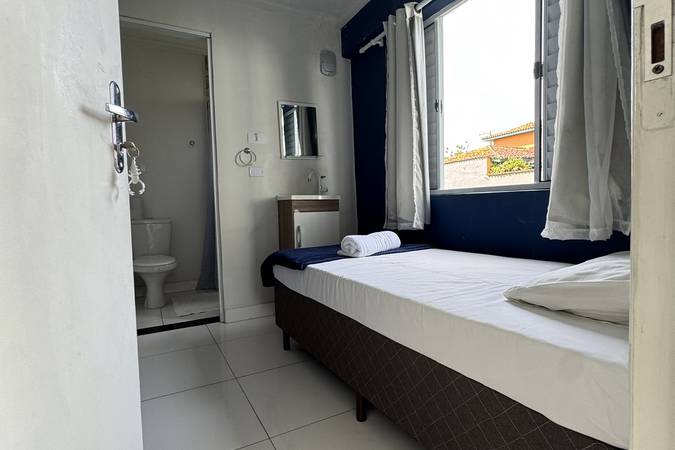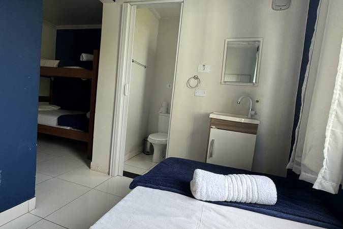 A acomodação Externa Térreo Família é perfeita para grandes grupos, hospedando até 05 pessoas em uma cama casal, um beliche e mais uma cama solteiro, e com as seguintes comodidades: