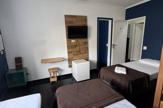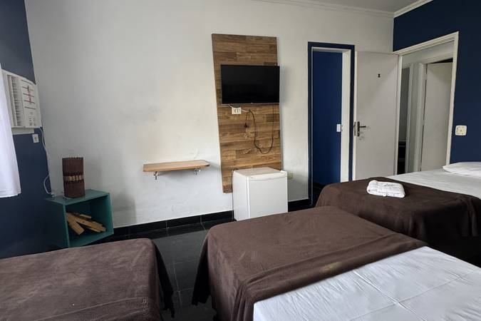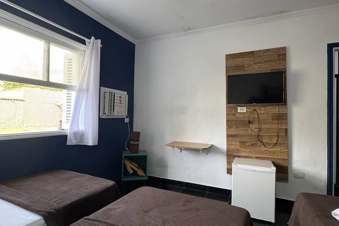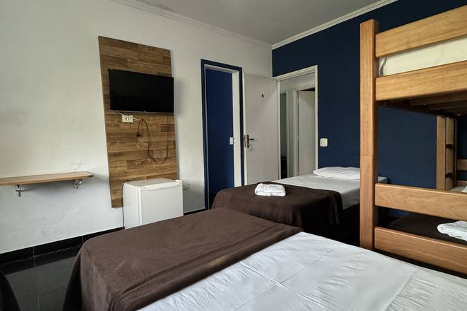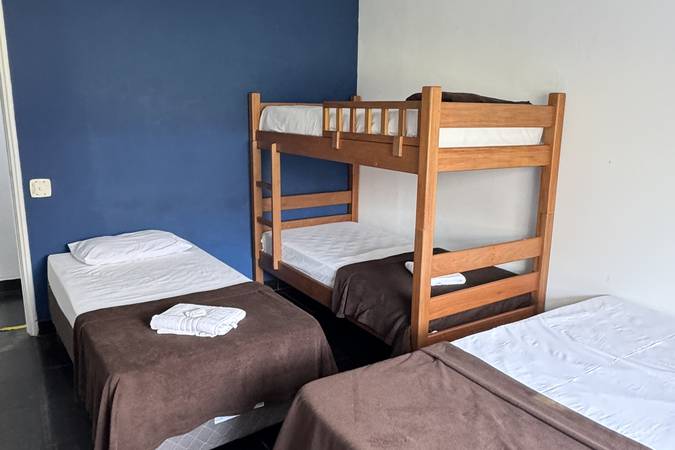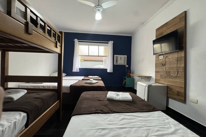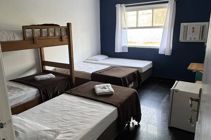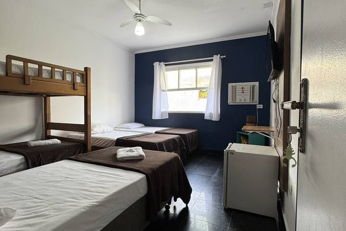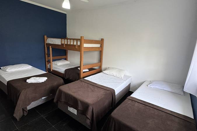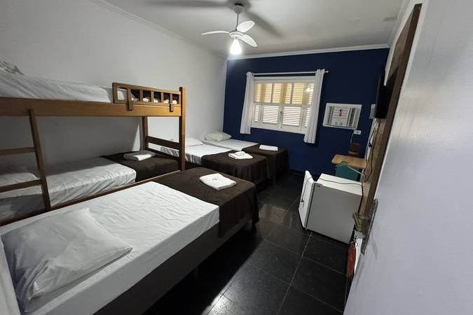 Nosso Quarto 2 é da categoria Home Térreo Família, que hospeda confortavelmente até 5 pessoas com uma cama casal + uma cama solteiro + um bicama ou um beliche, e as seguintes comodidades: