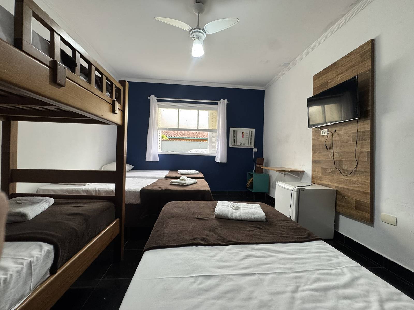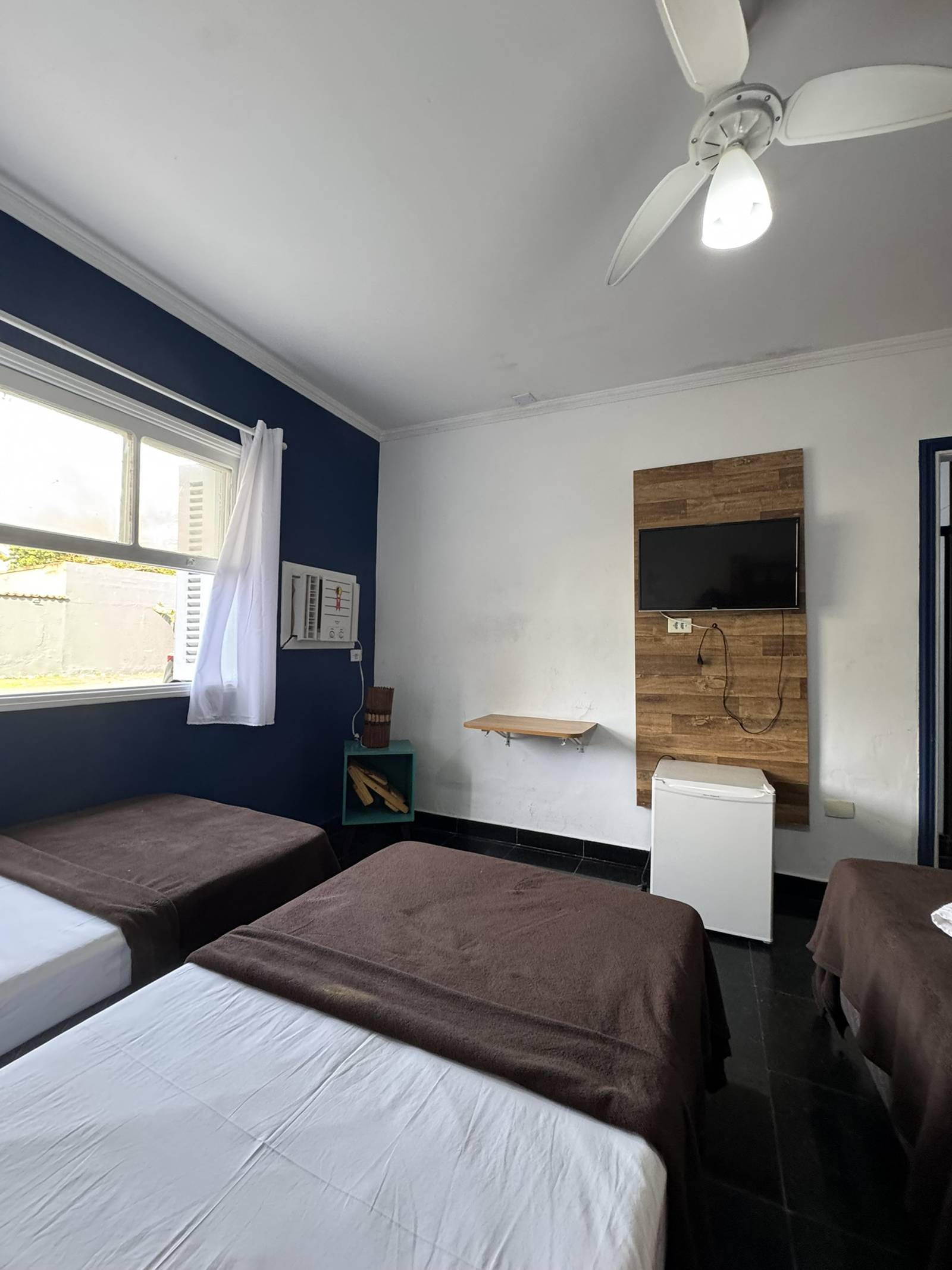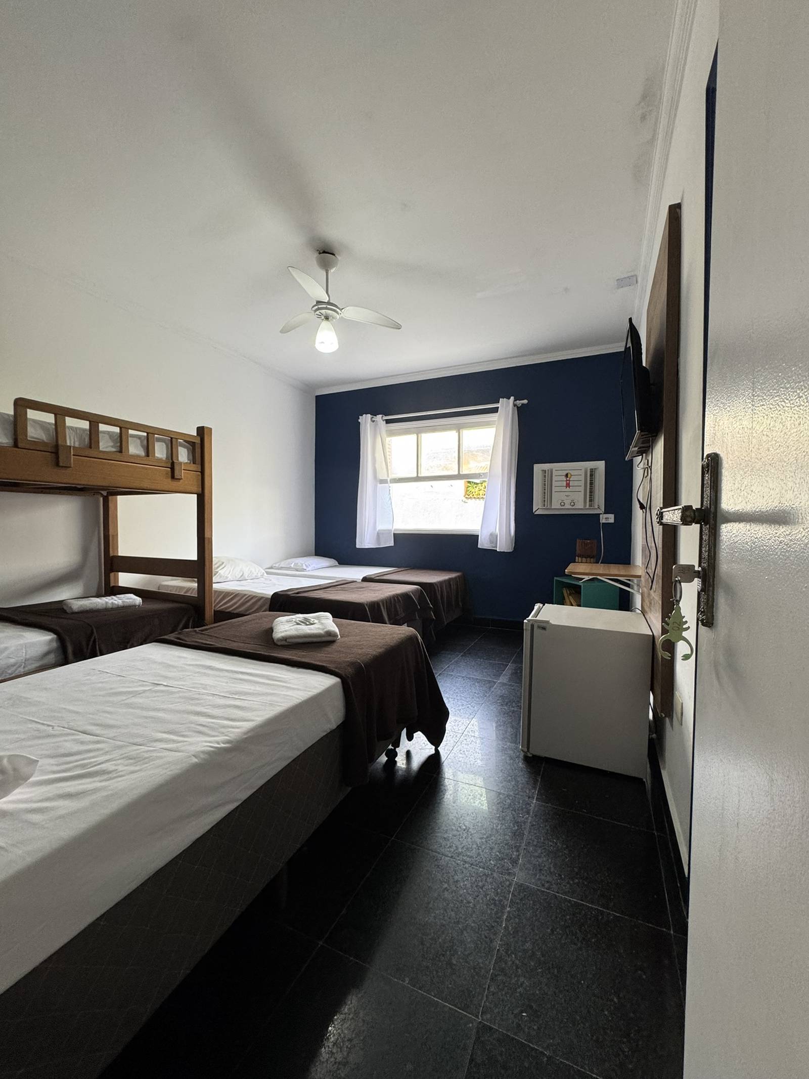 Nosso Quarto 2 é da categoria Home Térreo Família, que hospeda confortavelmente até 5 pessoas com uma cama casal + uma cama solteiro + um bicama ou um beliche, e as seguintes comodidades: